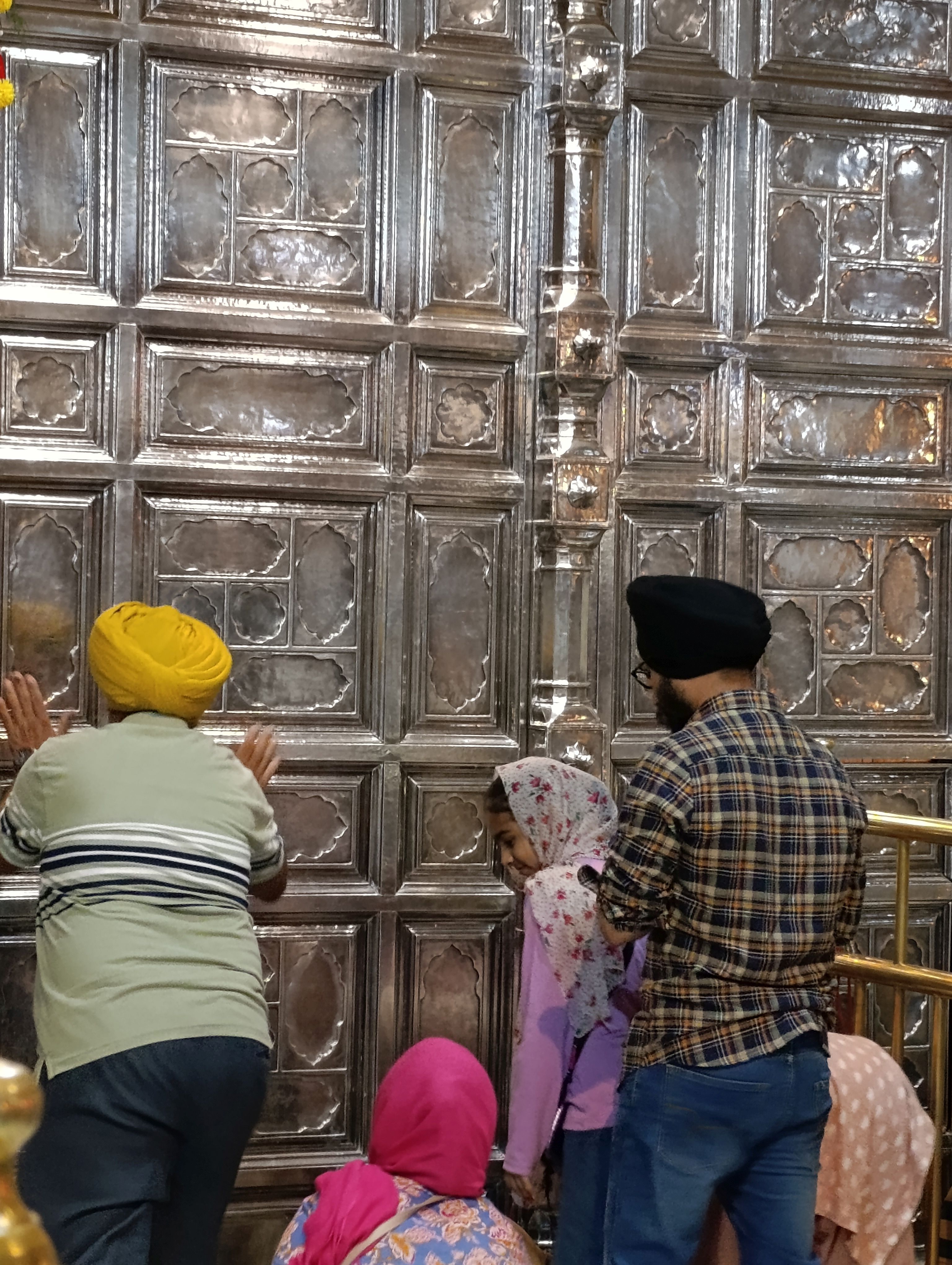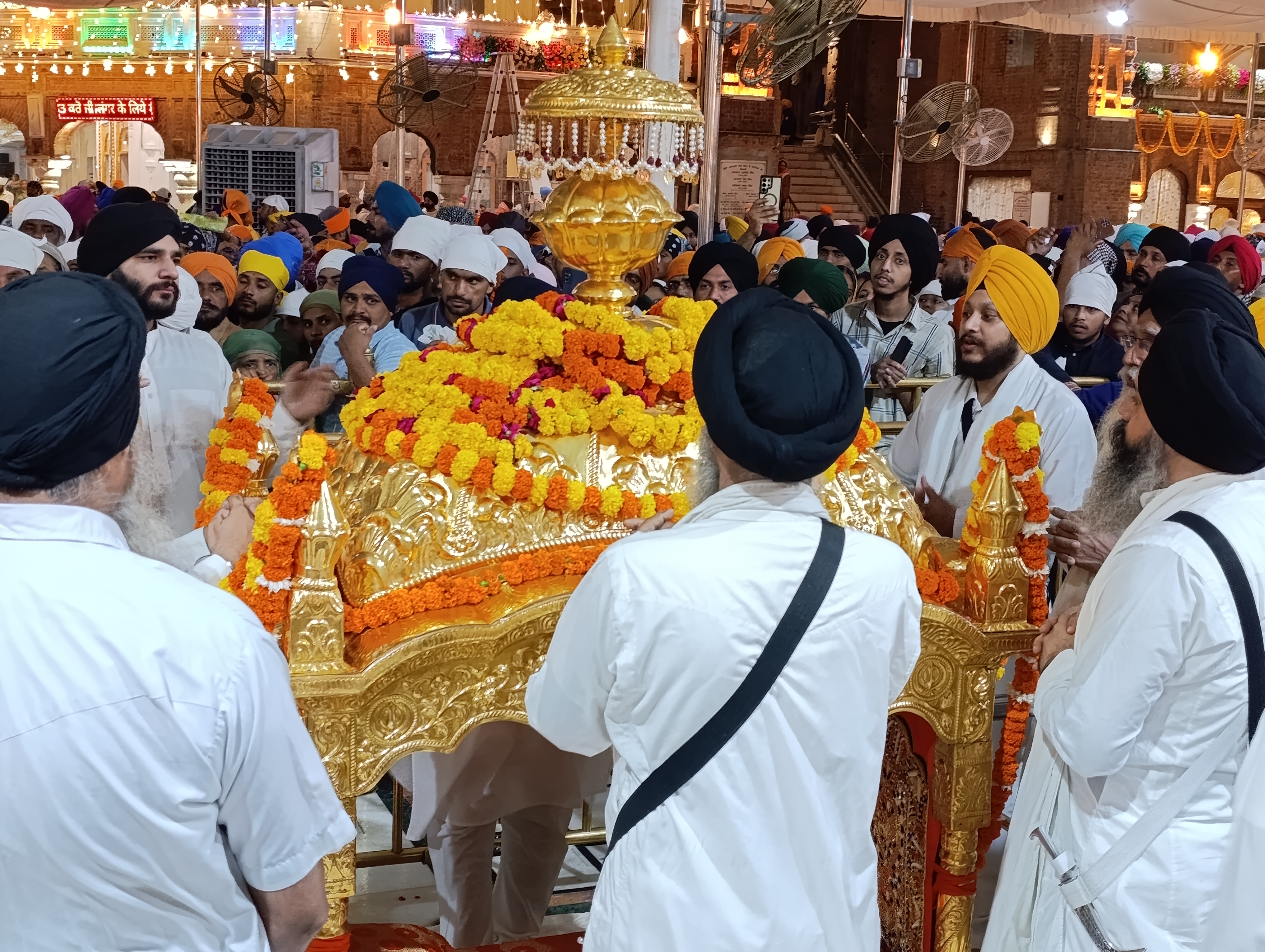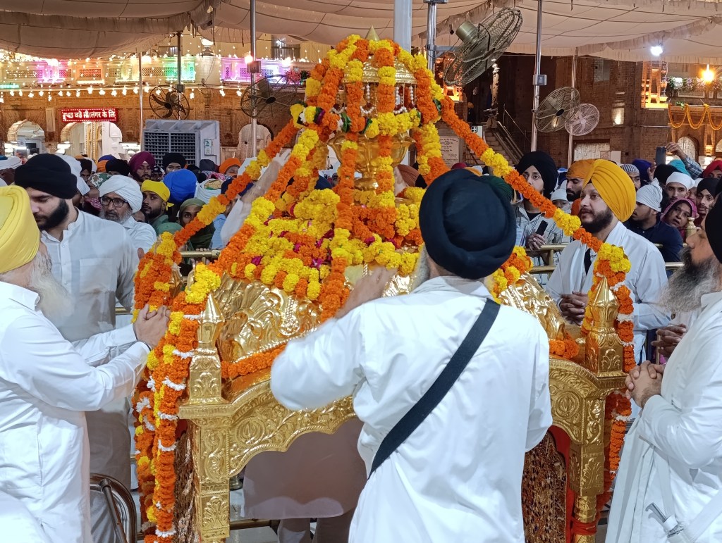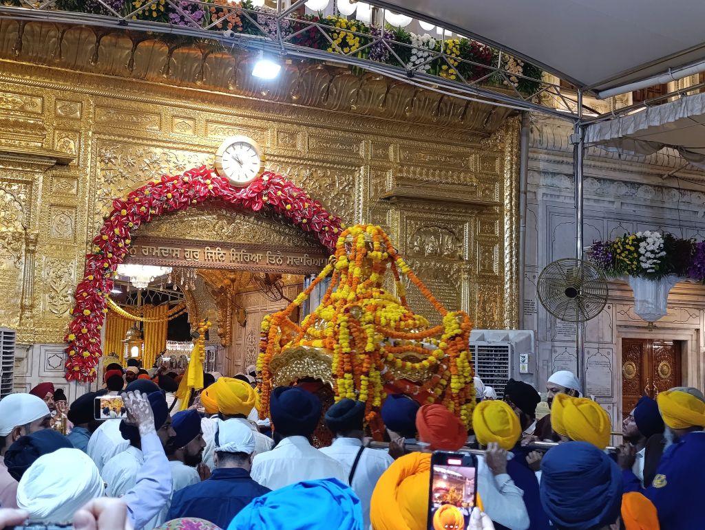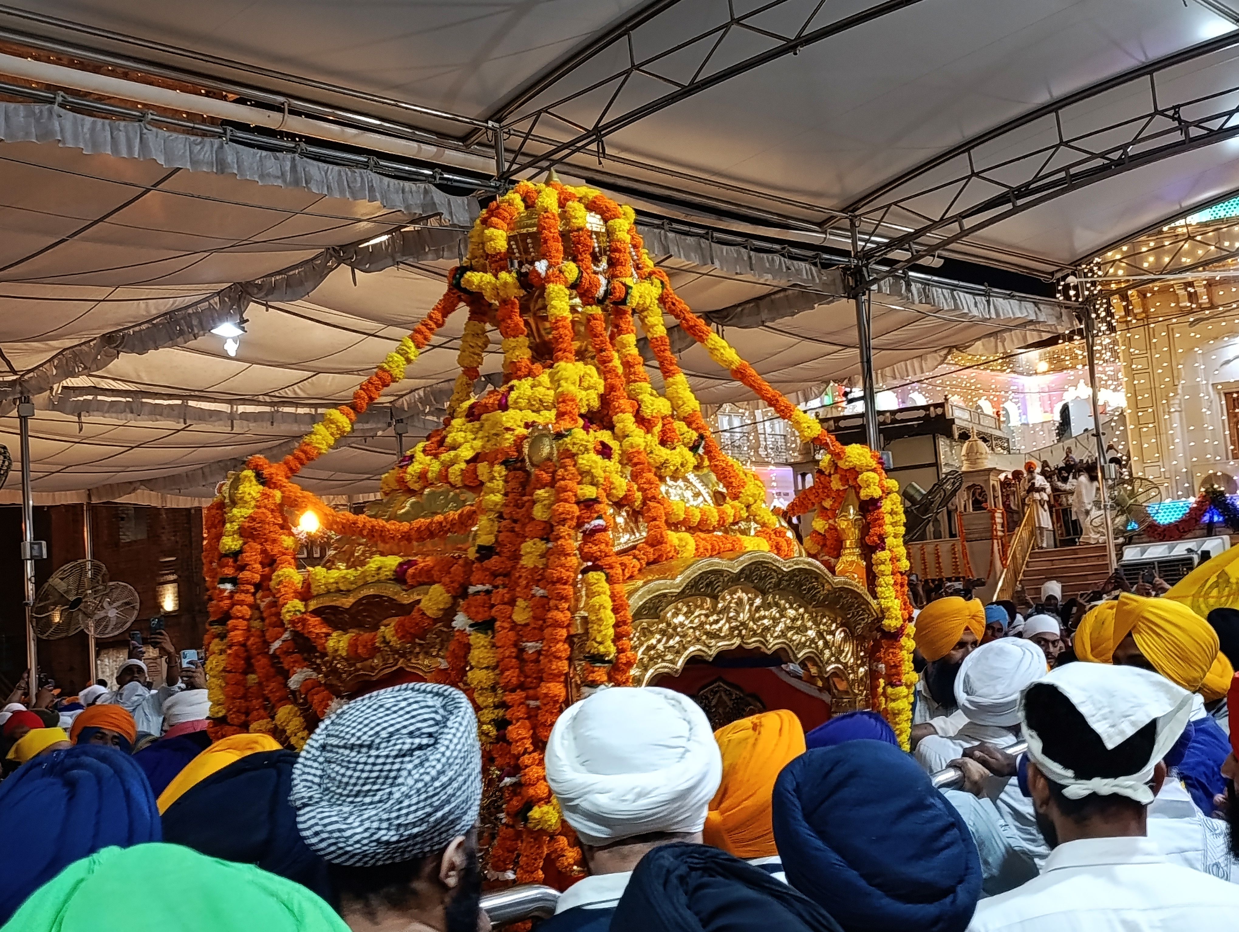 Ahogy minden szikh templom (gurdvára) oltárán, úgy a Harmadirban is a Guru Granth Száhib, a szent könyv van elhelyezve. A hívek a könyv előtt róják le tiszteletüket. A hódolat módja egyes részleteiben hasonlít a hindu istenségek tiszteletéhez, akiket saját templomaikban uralkodói pompával vesznek körül és királyi bánásmódban részesítenek (öltöztetés, drága ékszerek, szórakoztatás tánccal stb.). A Granth Száhib esetében ez úgy valósul meg, hogy pl. este aludni viszik, reggel felébresztik, párnákkal bélelt baldachinos gyaloghintón szállítják stb. A késő esti szertartás, aminek pipiskedve, nyakunkat nyújtogatva mi is szemtanúi lehettünk, arról szól, hogy a Granth Száhibot az oltárról leemelik, és a hordszékbe helyezve a hívek és kíváncsiak összegyűlt és izgatottan videózó tömege között, rézkorlátokkal szabadon tartott sávban futólépésben éjszakai nyughelyére viszik. Láttuk, hogy sokan otthon maradt szeretteik – nagymama, nagypapa, család – számára streamelik az eseményeket – ezt máshol, pl. Haridvárban a Gangesznek bemutatott esti fényáldozaton is megfigyeltük. Az arannyal borított palankinban minden este cserélik a terítőket, párnahajakat, kvázi “ágyat húznak”. Ezután nagy műgonddal feldíszítik a gyaloghintót, amihez sárga és bíborszínű büdöskékből font virágfüzérek tucatjait használják fel. A gyakorlott mozdulatokból látszik, hogy minden este pontosan ugyanazt, ugyanúgy csinálják, improvizálásnak nincs helye. Mikor mindez elkészült, a hordszéket cipelők letáboroznak a szentély előtt és várják a jelet, hogy belépjenek. Közben a hatalmas csarnok másik oldalán kígyózó sorokban várakozó hívők még reménykednek abban, hogy az utolsó pillanatban bejuthatnak a szentélybe, hogy pillantást vessenek a szent könyvre, mielőtt az nyugovóra tér. Az őr azonban a tömeg nyomása ellenére határozott és nem ismer pardont: kb. minden tucat ember után lecsapja, mint valami sorompót, a továbbhaladást megakadályozó rézrudat. Az emberek résen vannak, rendszerint az utolsók is elkerülik, hogy fejbe csapja őket a súlyos rúd. Időközben a hordszék bejut a szentélybe, elhelyezik rajta a Könyvet – ezt természetesen mi, akik a szetély előtti csarnokban állunk, nem látjuk, csak azt, hogy felbukkan a gyaloghintó, épp csak a tetejét látjuk, majd villámgyorsan elhalad előttünk, és máris a csarnok túlsó végén tűnik fel, mielőtt eltűnne a “hálószoba” felé vezető kanyarban. A szentély hatalmas, domborított díszítésű ezüstajtaja döndülve bezárul. Aki eddig nem jutott be a szentélybe, az aznap már nem is fog, de másnap újra megpróbálhatja. Láttuk is kifelé menet az épület külső fala mentén a hideg márványon hálózsákokban alvó zarándokok hosszú sorát, a falra merőlegesen szinte hézagmentesen elrendeződve, mint a szardíniák. Bejáratott dolognak tűnt ez is, bebocsátásra várva a szent templom oldalában éjszakáznak a zarándokok, hogy másnap kora reggel az elsők között állhassanak be a szentélyhez vezető sorba.