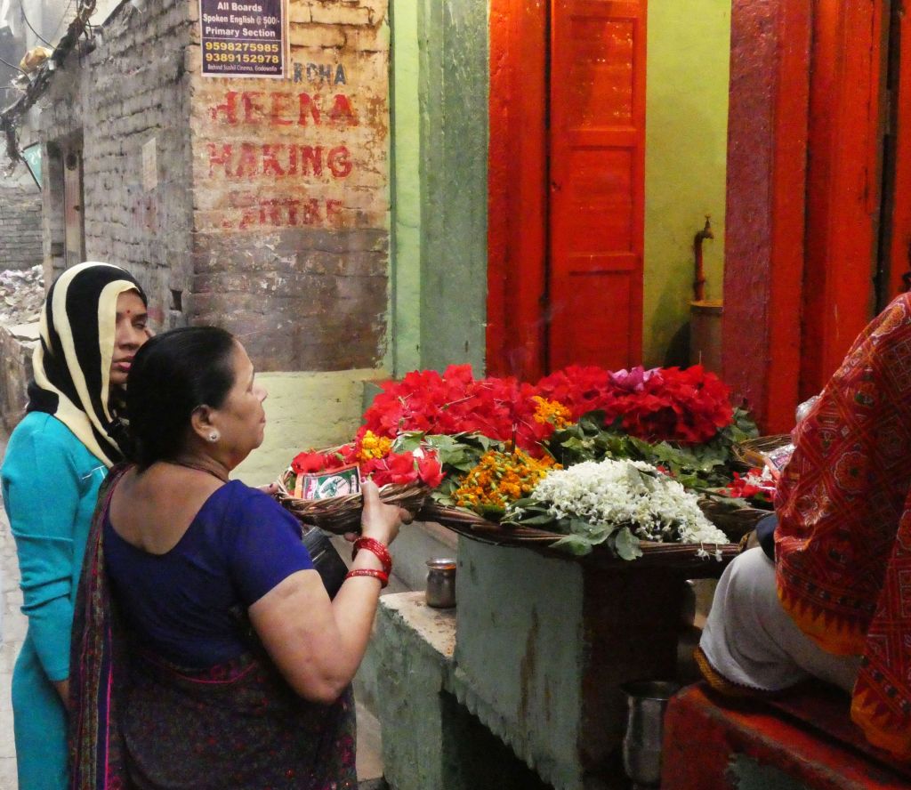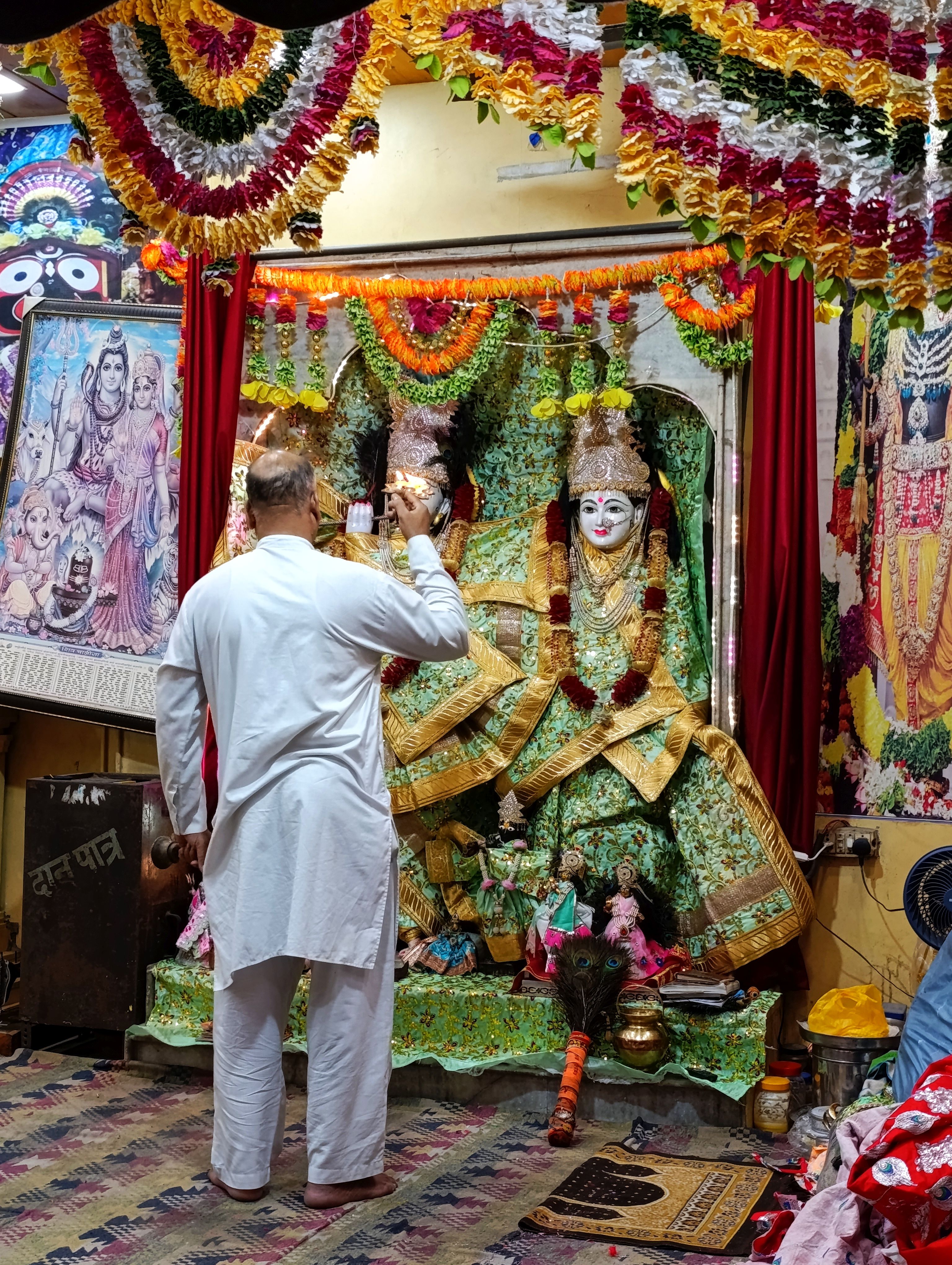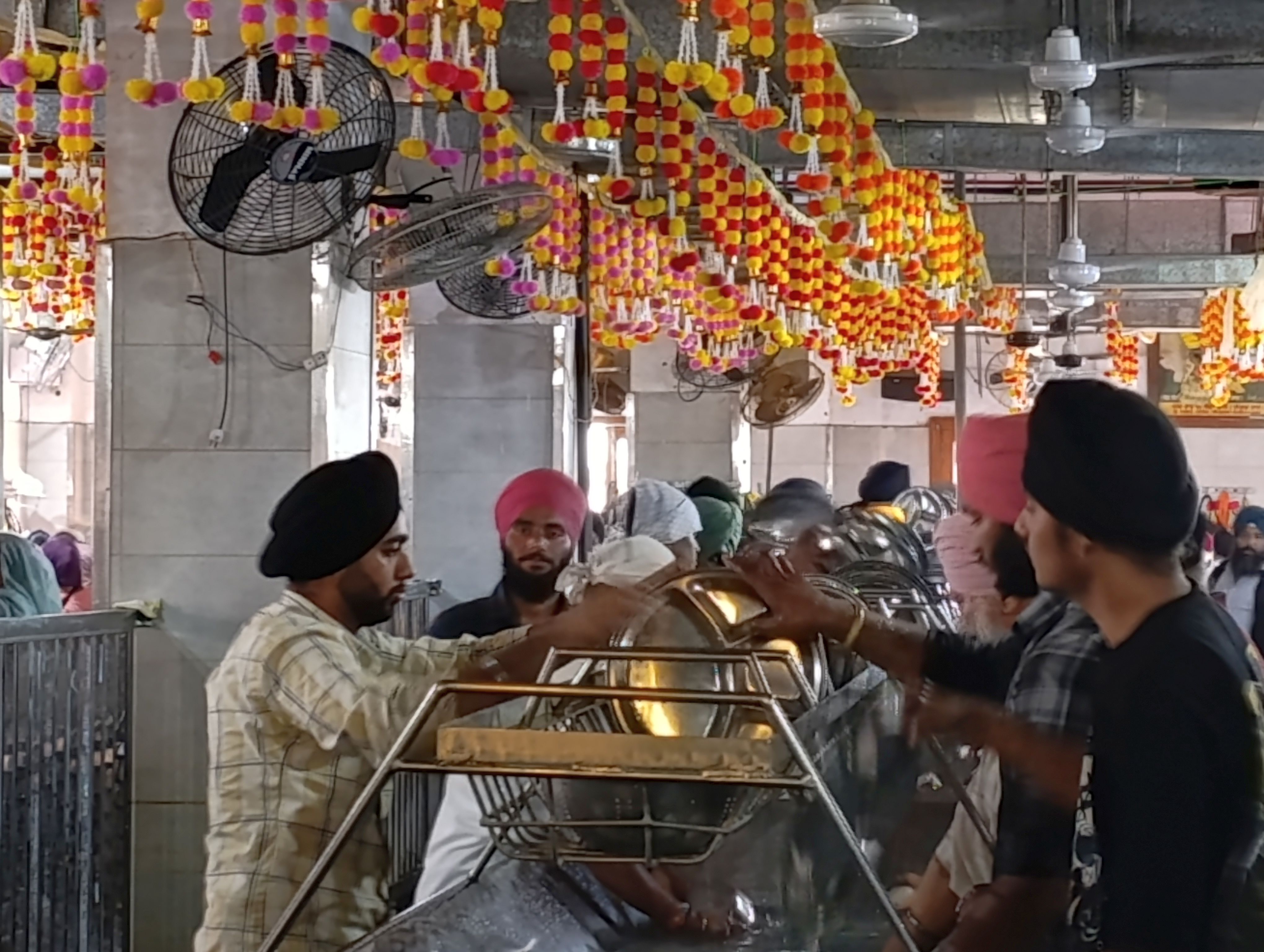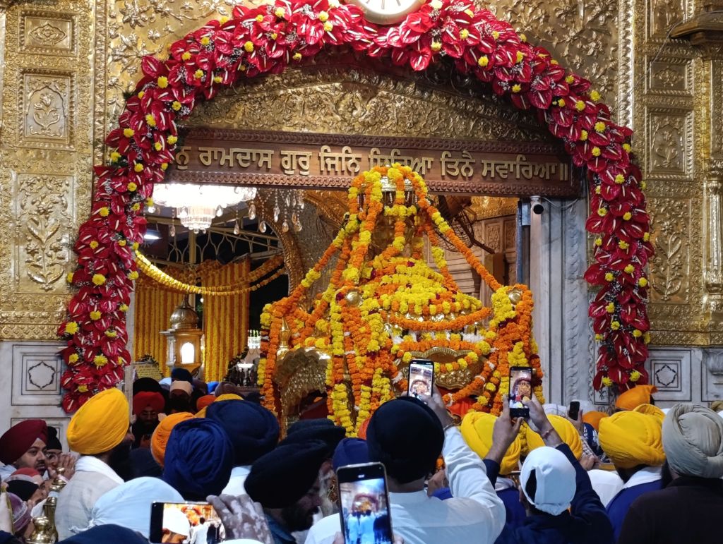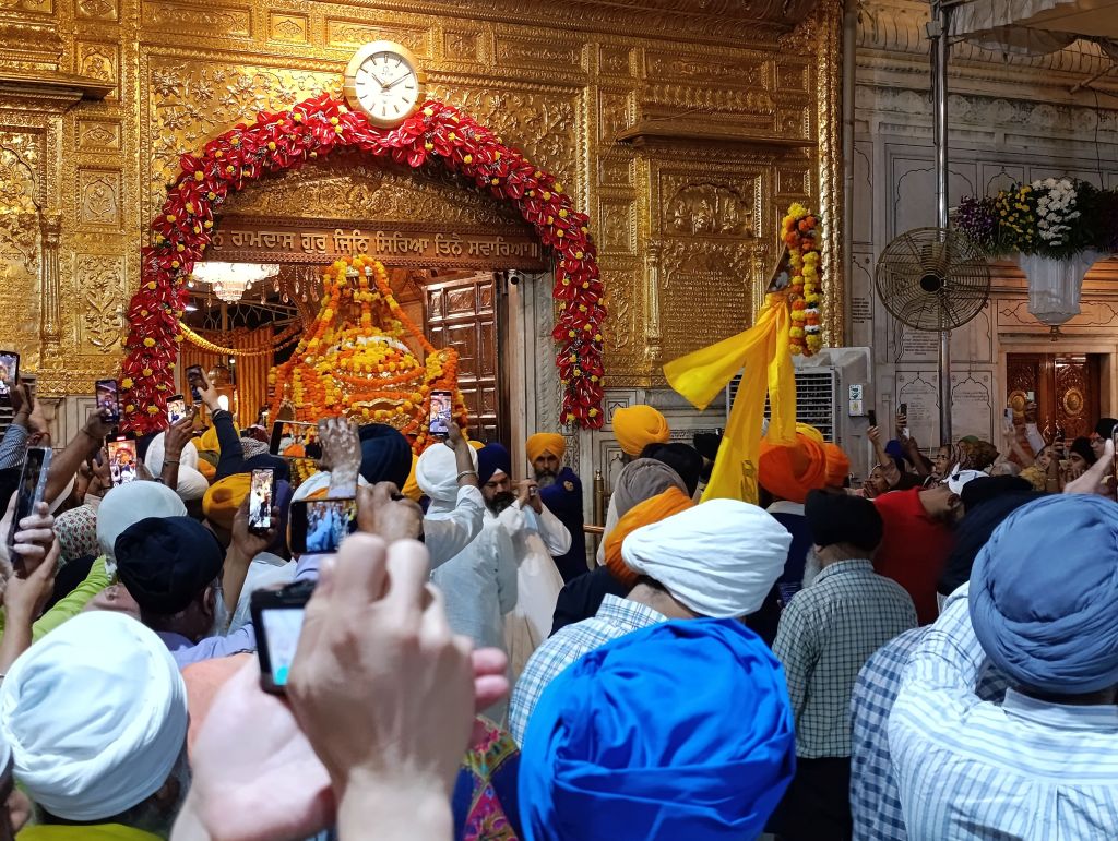 Ahogy minden szikh templom (gurdvára) oltárán, úgy a Harmadirban is a Guru Granth Száhib, a szent könyv van elhelyezve. A hívek a könyv előtt róják le tiszteletüket. A hódolat módja egyes részleteiben hasonlít a hindu istenségek tiszteletéhez, akiket saját templomaikban uralkodói pompával vesznek körül és királyi bánásmódban részesítenek (öltöztetés, drága ékszerek, szórakoztatás tánccal stb.). A Granth Száhib esetében ez úgy valósul meg, hogy pl. este aludni viszik, reggel felébresztik, párnákkal bélelt baldachinos gyaloghintón szállítják stb. A késő esti szertartás, aminek pipiskedve, nyakunkat nyújtogatva mi is szemtanúi lehettünk, arról szól, hogy a Granth Száhibot az oltárról leemelik, és a hordszékbe helyezve a hívek és kíváncsiak összegyűlt és izgatottan videózó tömege között, rézkorlátokkal szabadon tartott sávban futólépésben éjszakai nyughelyére viszik. Láttuk, hogy sokan otthon maradt szeretteik – nagymama, nagypapa, család – számára streamelik az eseményeket – ezt máshol, pl. Haridvárban a Gangesznek bemutatott esti fényáldozaton is megfigyeltük. Az arannyal borított palankinban minden este cserélik a terítőket, párnahajakat, kvázi “ágyat húznak”. Ezután nagy műgonddal feldíszítik a gyaloghintót, amihez sárga és bíborszínű büdöskékből font virágfüzérek tucatjait használják fel. A gyakorlott mozdulatokból látszik, hogy minden este pontosan ugyanazt, ugyanúgy csinálják, improvizálásnak nincs helye. Mikor mindez elkészült, a hordszéket cipelők letáboroznak a szentély előtt és várják a jelet, hogy belépjenek. Közben a hatalmas csarnok másik oldalán kígyózó sorokban várakozó hívők még reménykednek abban, hogy az utolsó pillanatban bejuthatnak a szentélybe, hogy pillantást vessenek a szent könyvre, mielőtt az nyugovóra tér. Az őr azonban a tömeg nyomása ellenére határozott és nem ismer pardont: kb. minden tucat ember után lecsapja, mint valami sorompót, a továbbhaladást megakadályozó rézrudat. Az emberek résen vannak, rendszerint az utolsók is elkerülik, hogy fejbe csapja őket a súlyos rúd. Időközben a hordszék bejut a szentélybe, elhelyezik rajta a Könyvet – ezt természetesen mi, akik a szetély előtti csarnokban állunk, nem látjuk, csak azt, hogy felbukkan a gyaloghintó, épp csak a tetejét látjuk, majd villámgyorsan elhalad előttünk, és máris a csarnok túlsó végén tűnik fel, mielőtt eltűnne a “hálószoba” felé vezető kanyarban. A szentély hatalmas, domborított díszítésű ezüstajtaja döndülve bezárul. Aki eddig nem jutott be a szentélybe, az aznap már nem is fog, de másnap újra megpróbálhatja. Láttuk is kifelé menet az épület külső fala mentén a hideg márványon hálózsákokban alvó zarándokok hosszú sorát, a falra merőlegesen szinte hézagmentesen elrendeződve, mint a szardíniák. Bejáratott dolognak tűnt ez is, bebocsátásra várva a szent templom oldalában éjszakáznak a zarándokok, hogy másnap kora reggel az elsők között állhassanak be a szentélyhez vezető sorba.