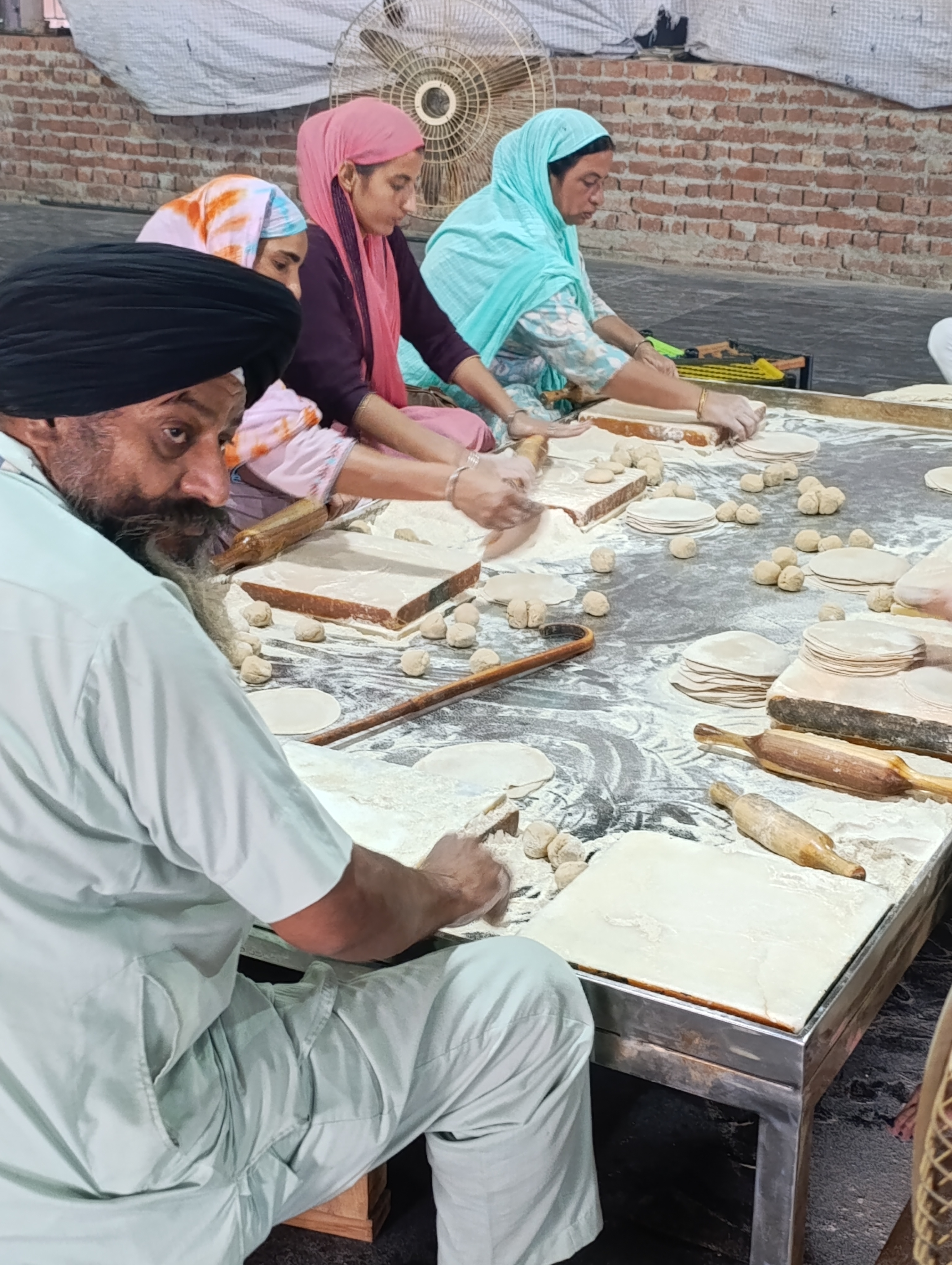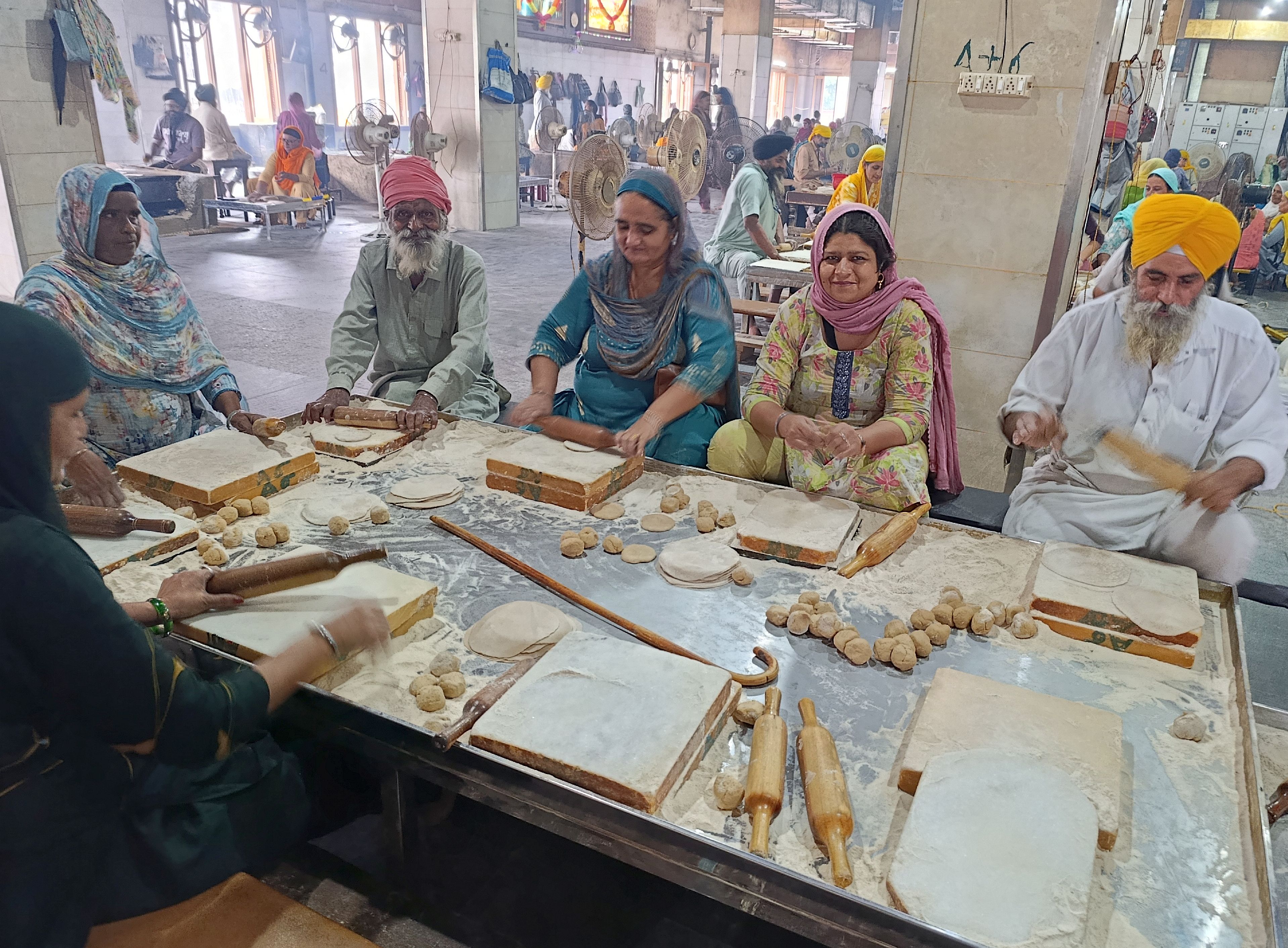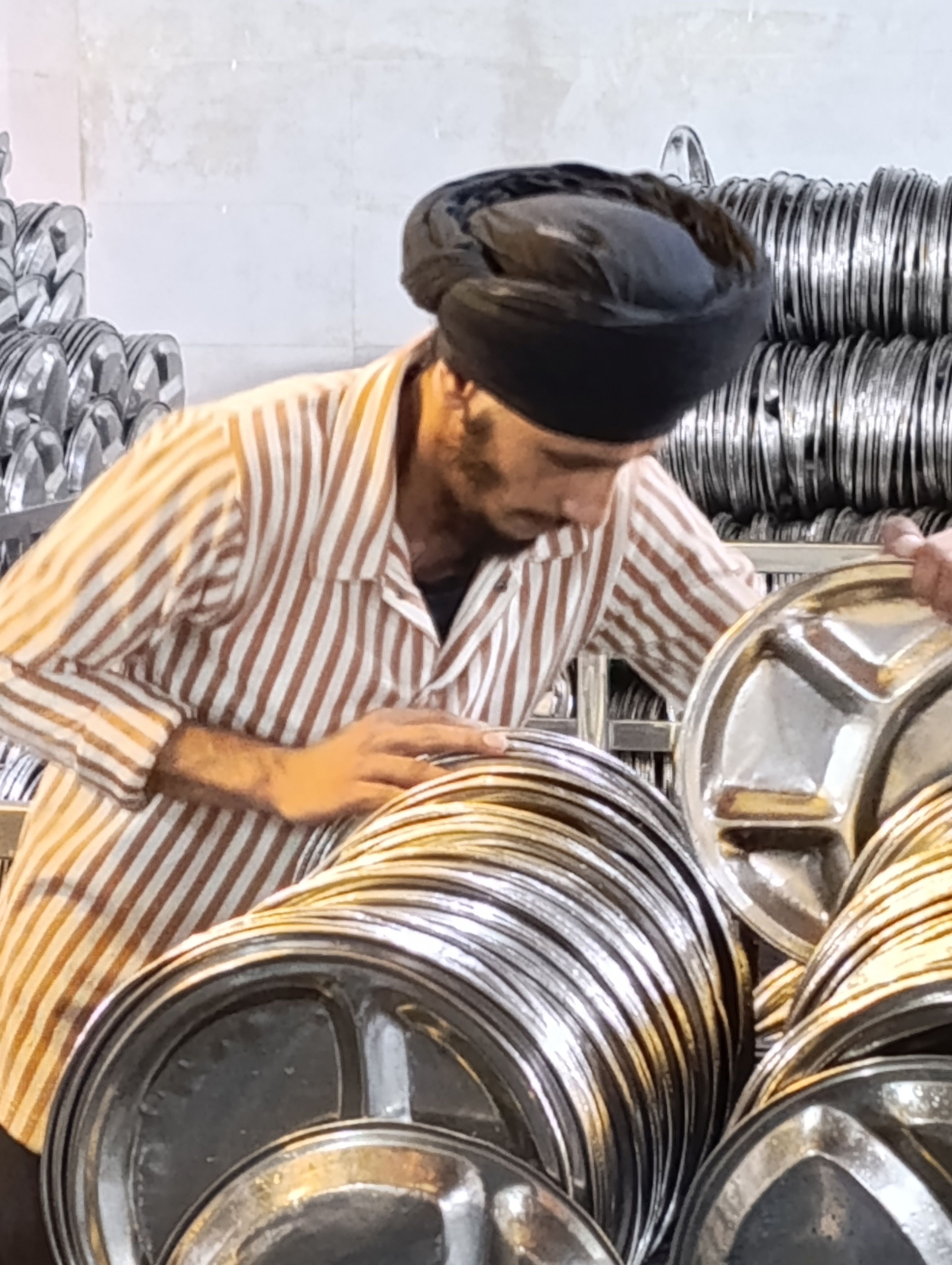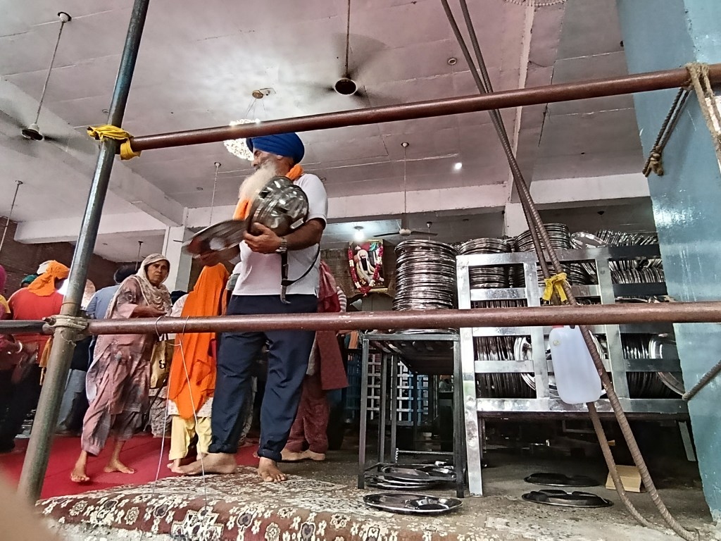 Utunk első szakaszának végén, mielőtt himalájai gyalogtúránknak nekivágtunk volna, útitársaimat megkérdeztem, hogy addig mi tetszett nekik a legjobban. Többen a Harmandir közösségi konyháját említették. A konyha elvi alapvetése – fenntartás adományokból és önkéntes munkával, és hogy kérdés nélkül bárki kaphat ennivalót, aki erre igényt tart -, a puszta méretek – naponta 100.000 ember ebédhez juttatása és az ehhez szükséges hatalmas mennyiségű hozzávaló, eszköz és nagyszámú személyzet, valamint a működtetés bámulatos szervezettsége egyenként és összességében tiszteletet ébreszt. És egy kicsit talán irigységet is (?), hogy ezt is lehet, így is lehet, van ilyen összefogás, van ilyen közösség. Nem egyszer-egyszer, kivételes alkalmakkor, hanem folyamatosan, napról napra. Itt mindenki tudja a dolgát és szó nélkül végzi. Pedig szinte mindenki önkéntes, kivéve az őrséget, amelynek tagjait a templom alkalmazza. Körbejártukaz gész létesítményt. Csak a hagymatisztítás egy egész csarnokot töltött be: egyik felében a kupacokba tornyozott hagyma, másikban a fokhagyma adott munkát több tucatnyi férfinek és asszonynak. Mellettük nagy kupacokban tornyosult a hagyma és jókora vesszőkosarakban várakozott a fokhagyma. Hasonló arányokat ölt a csapátikészítés. Más-más helyen történik a tészta előkészítése, gyúrása, darabolása, nyújtása és sütése. Megdöbbentünk, hogy egy-egy önkéntesnek 10.000 csapátit kell naponta sütnie! A csapáti nyílt tűzön készül. Elnéztem az egyik asszonyt: ül a forró tűzhely mellett, egész nap dől rá a füst, de mintha észre se venné, süti, forgatja, dobálja a kész csapátikat percnyi pihenő nélkül. Amikor fényképeztünk, senki sem volt rest ránkmosolyogni, vagy felállni, odajönni és közösen fotózkodni. Az ételek hatalmas acélüstökben főnek. A tulajdonképpeni étkező egy mérhetetlen nagy csarnok kettéosztva: amíg az egyik felében eszik egy csoport, addig a másik felében leszednek és terítenek, majd csere. Az étkezés a földön, hosszú párhuzamos sorokban történik. Az ennivalót nagy acélvödrökben hozzák és hatalmas kanalakkal merik a tálcák mélyedéseibe. Ivásra külön helyek vannak kijelölve az épületben. Az egész épületben mezítláb kell járni, hiszen ez is a templom része. A legimpresszívebb a mosogatás: hosszú vályúk mellett sorakoznak a mosogatók, többségükben férfiak, akik némi lötybölés után a vályú feletti csöpögtetőre rakják vagy inkább dobják az edényt. Minden eszköz nemesacélból van, nem törtik. A rengeteg edény mozgatása is az olajozottan működő logisztika fontos része. Elgondolkodtam, milyen érdekes, hogy a híresen káoszos Indiában a vallásokhoz kapcsolódó megmozdulások, rendezvények, fesztiválok lebonyolítása, a hatalmas tömegek mozgatása bámulatos szervezettséggel történik. Gondoljunk csak a világ legnagyobb vallási fesztiváljára, a kumbh mélára, ahol a zarándokokszáma meghaladhatjaa 100 milliót. Kumbh ugyan nem mindig egyforma, van kisebb és nagyobb. Az idei, 12 évente sorra kerülő nagy kumbhon (mahá kumbh mélá) az ünnep 45 napja alatt 660 millió (!) zarándok fordult meg.