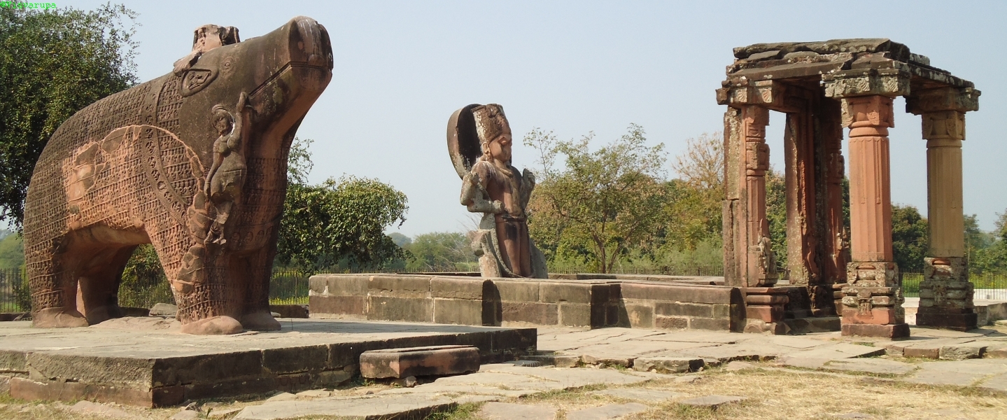 Visnu-templom. Jobbra a templom bejárati oszlopai, középen Visnu szobra az egykori szentély helyén, balra Visnu Vadkan megtestesülése. Eran, Madhya Pradesh (Sagar District), Gupta-kor, 5. század, 6. század eleje október 6, 2015október 6, 2015 1439 × 600 10p_g1